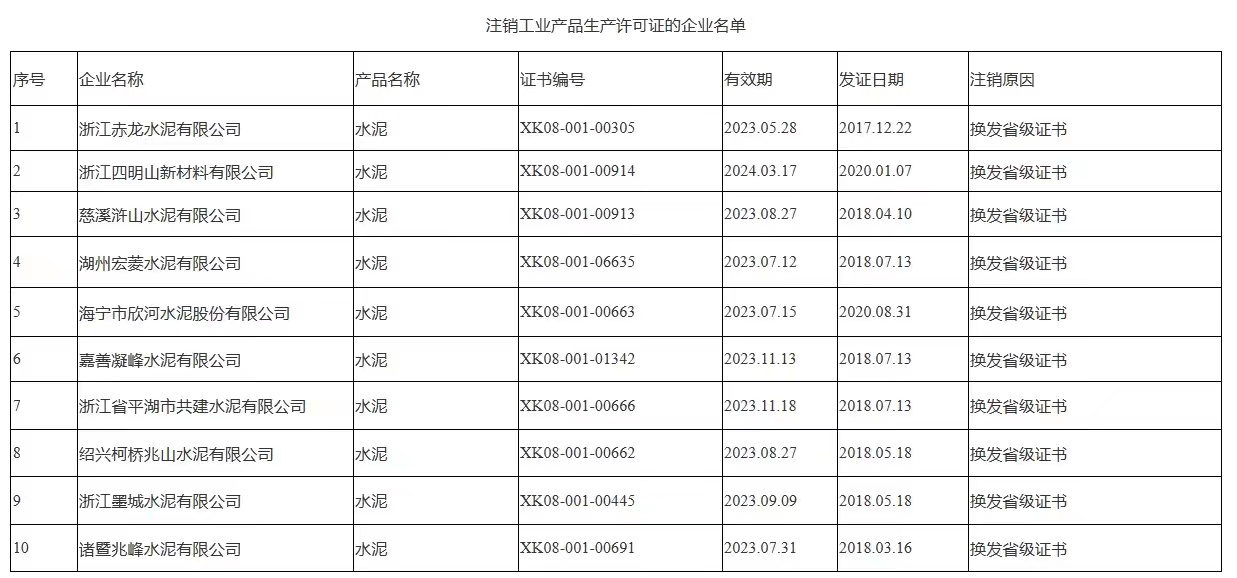 其中包括十家水泥企業(yè),注銷原因均為換發(fā)省級證書: