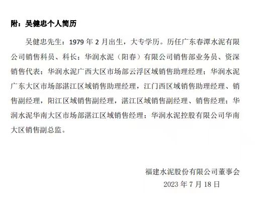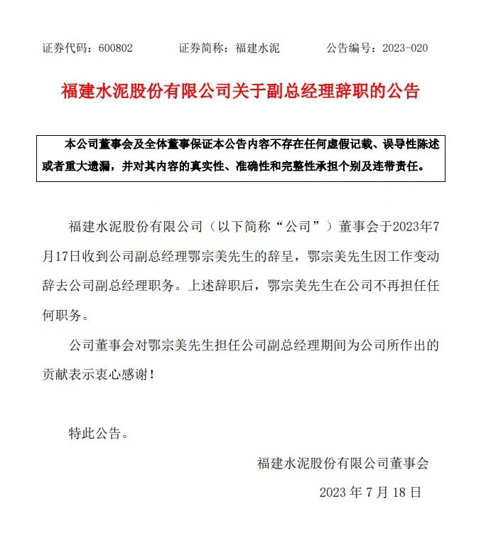 福建水泥公告,公司董事會收到公司副總經理鄂宗美的辭呈,鄂宗美因工作變動辭去公司副總經理職務。上述辭職后,鄂宗美在公司不再擔任任何職務。同日公告經控股股東推薦,董事會提名委員會審查通過,同意聘任吳健忠先生為公司副總經理。