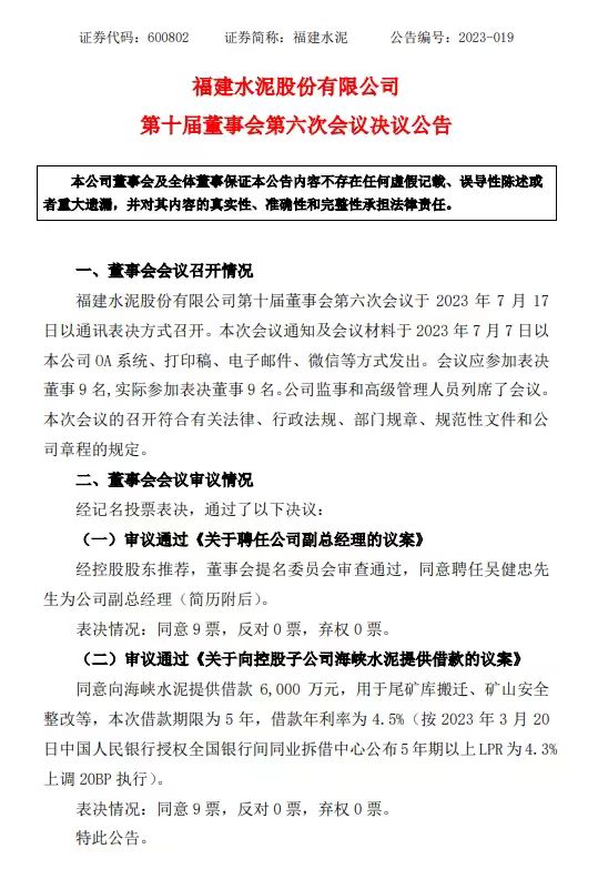 同期,公告審議通過《關于向控股子公司海峽水泥提供借款的議案》同意向海峽水泥提供借款6,000萬元,用于尾礦庫搬遷、礦山安全整改等,本次借款期限為5年,借款年利率為4.5%。