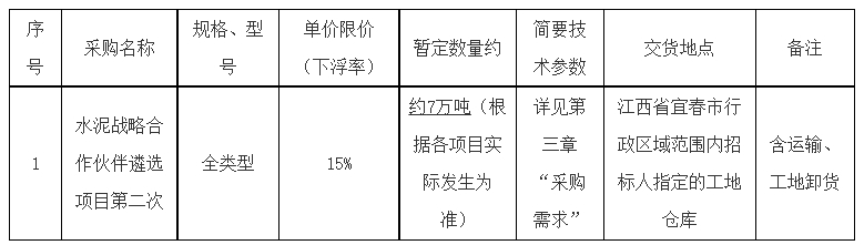 7月25日,江西省公共資源交易平臺發(fā)布江西中宜招標(biāo)咨詢有限公司關(guān)于水泥戰(zhàn)略合作伙伴遴選項目公開招標(biāo)公告。公告項目預(yù)算金額:2800萬元,數(shù)量約7萬噸。交貨地點(diǎn)在江西省宜春市行政區(qū)域范圍內(nèi)招標(biāo)人指定的工地倉庫。含運(yùn)輸、工地卸貨單價限價(下浮率)15%。服務(wù)期限:自合同簽訂之日起至2024年12月止。公告全文如下: